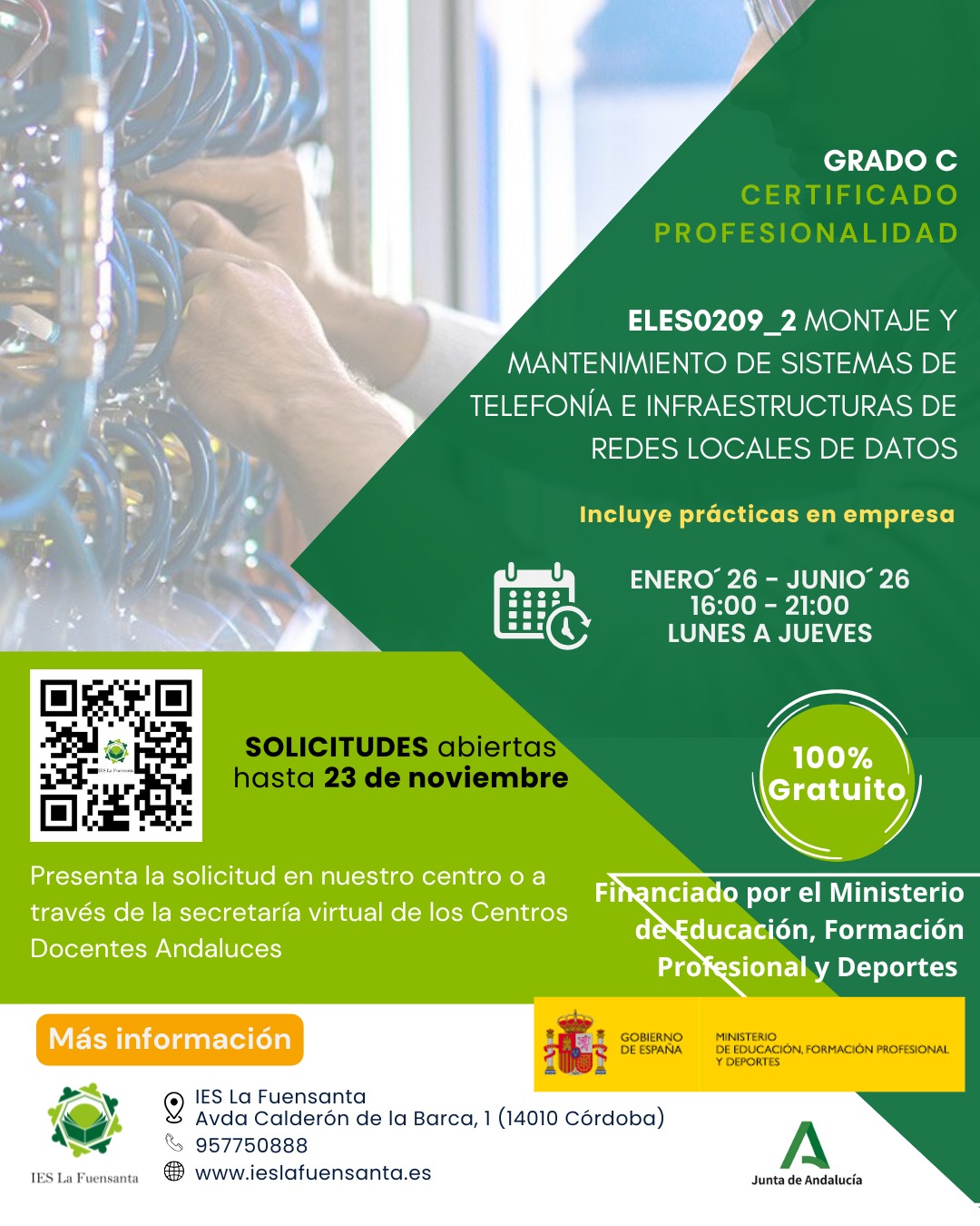 Ampliación plazo de solicitud. Curso de certificación profesional de nivel 2: Montaje y mantenimiento de sistemas de telefonía e infraestructuras de redes de voz y datos