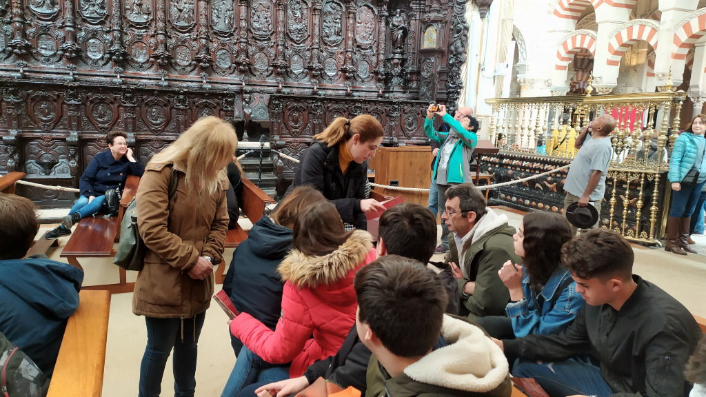 El alumnado de 1º de Bachillerato y 4º de la ESO estuvo dibujando el interior de la Mezquita-Catedral a mano alzada, acompañados de su profesora de dibujo Carmen López Rey. Los alumnos y alumnas de 3º de PMAR le hicieron una pequeña entrevista. A la pregunta de por qué llevaste a tus alumnos de excursión al casco histórico, ella respondió: “Porque para dibujar hay que observar y para observar tienes que ver patrimonio” y añadió: “No vi cuadros, vi arquitectura”. La profesora López Rey comentó que en una ocasión en que enfermó su padre, el cual ha sido profesor y al que quiere mucho, fueron a visitarlo muchísimos antiguos alumnos y al ver que era muy querido, pensó que él debió ser muy buen profesor, y sintió que quería ser profesora. Ante la pregunta de si alguna vez pensó en dejar su oficio, ella dijo que no, que nunca se lo había planteado.