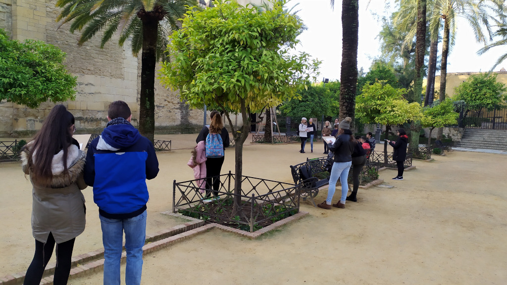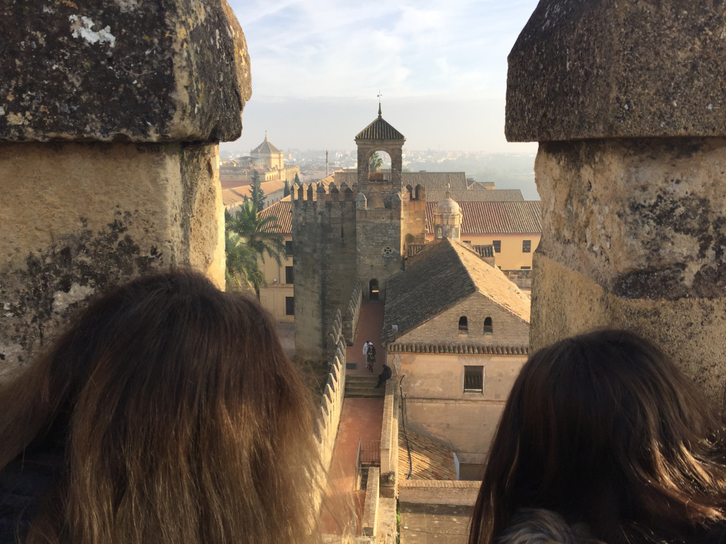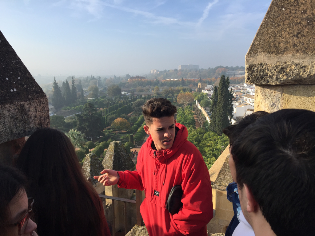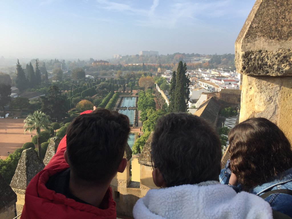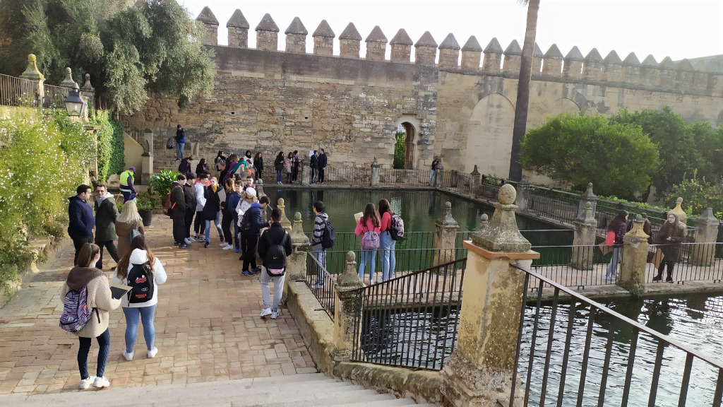 Seguidamente, se dirigieron al Alcázar de los Reyes Cristianos, visitaron los jardines y allí les explicaron la estatua de los reyes Isabel y Fernando con Cristóbal Colón, donde subieron a las torres, una estructura de defensa, y vieron el puente de Ibn Firnás. También estuvieron viendo las dependencias de la antigua cárcel, donde había señaladas cruces e iniciales hechas por los antiguos presos que fueron perseguidos por no ser 100% cristianos, por la Inquisición de Córdoba. En el interior, vieron el salón de los mosaicos.